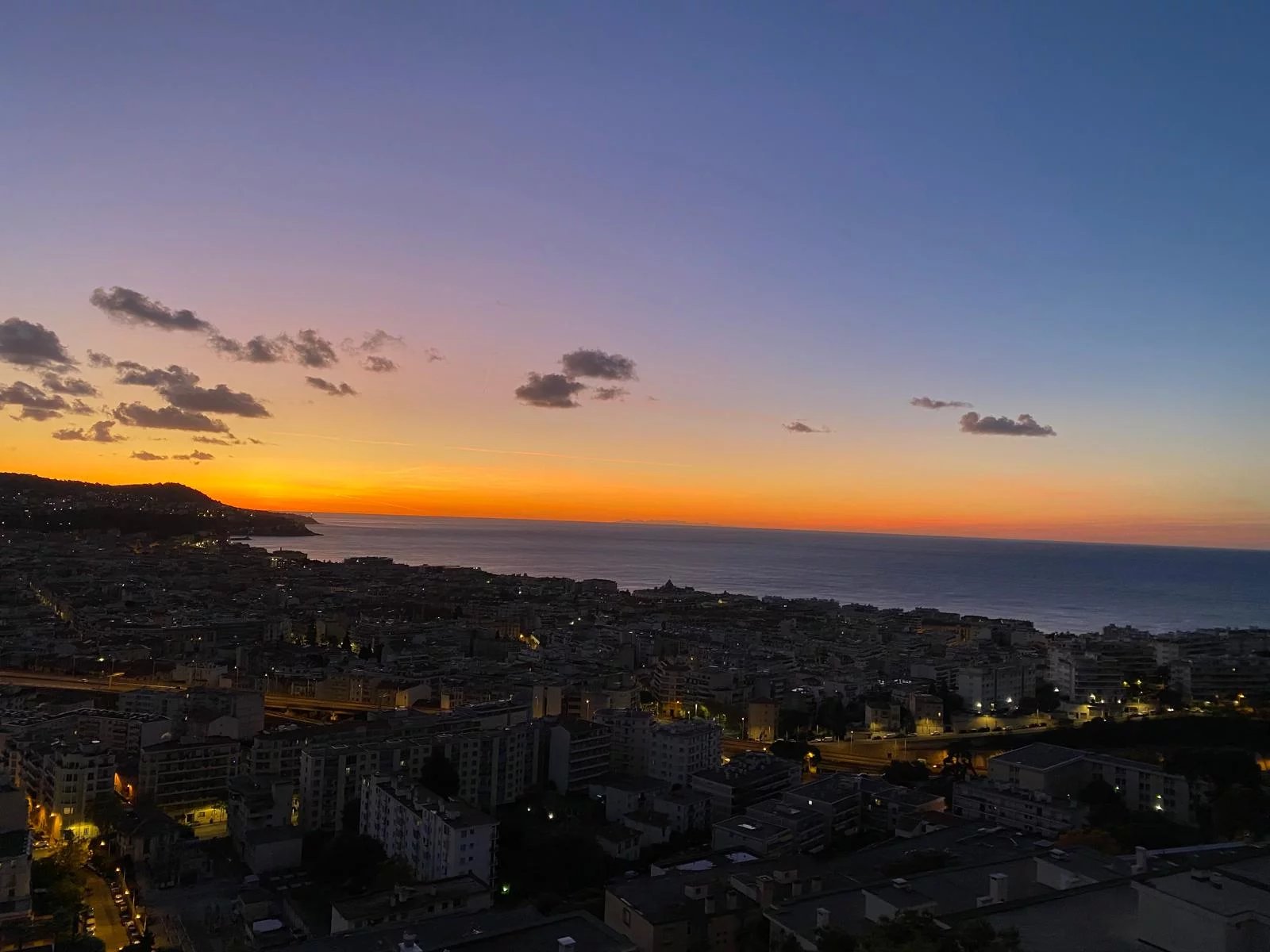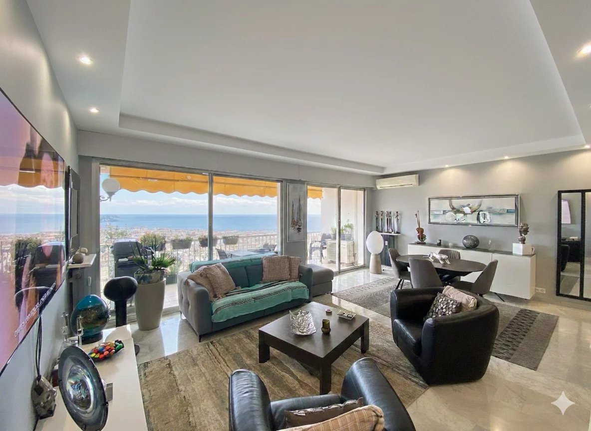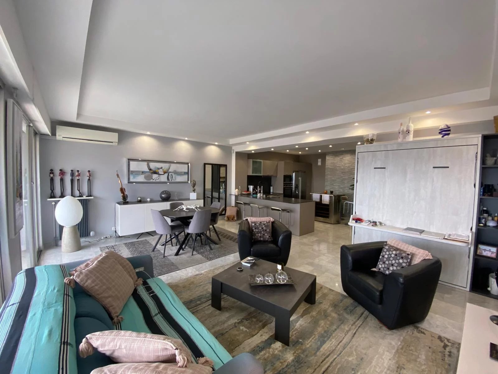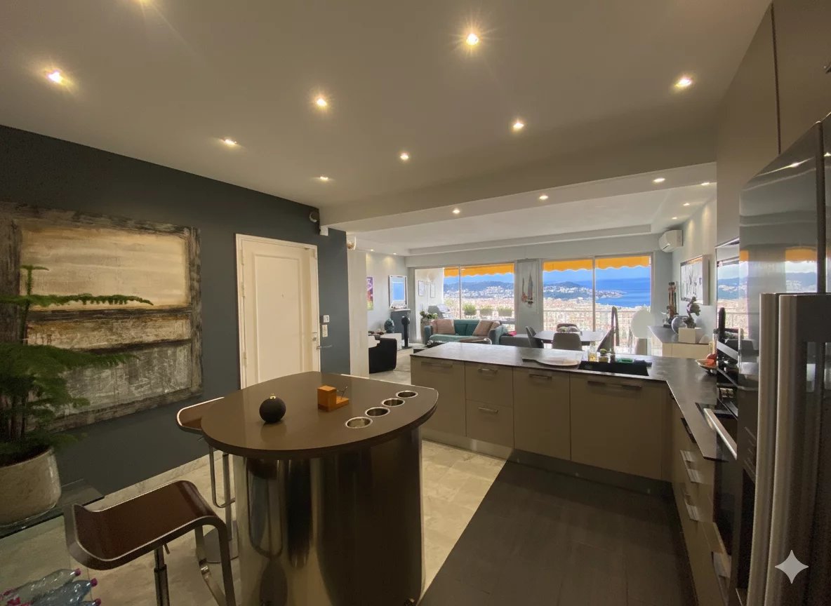 Vaste séjour de 50m² ouvert sur la terrasse et une vue mer et ville exceptionnelle belle cuisine high tech intégrée . Vaste chambre avec son balcon au calme absolu , rangements.
